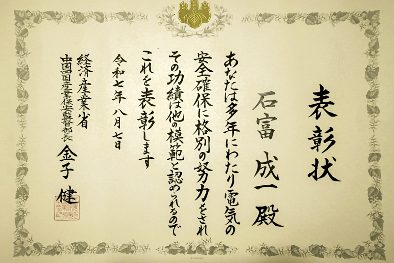 - 令和7年度 電気保安功労者 中国四国産業保安監督部長表彰