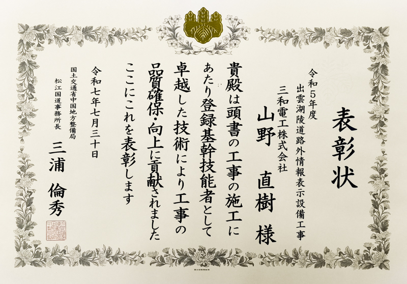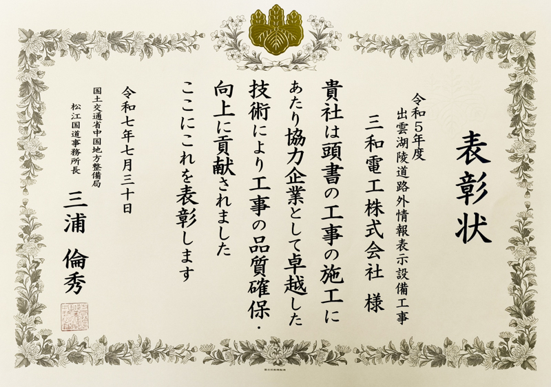 コイト電工株式会社様元請工事【令和5年度出雲湖陵道路外情報表示設備工事】の品質確保・向上に対する取組みが評価され、協力業者表彰並びに技能者表彰を受賞いたしました。